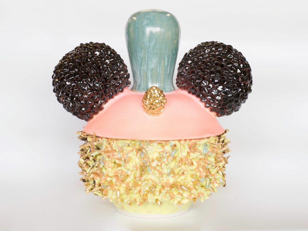 2025, Grès blanc, émaux jaunes et bruns foncés, peinture acrylique rose-bonbon, Ø.30 x H.38 cm, © King HoundekpinkouCourtesy Galerie Vallois DOFF
